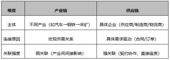 对比维度:从主体成分(产业链连接产业,供应链连接企业)、连接原因(产业链宏观供需,供应链具体需求驱动)、关联强度(产业链部分弱关联,供应链强关联靠契约)三个维度构建对比体系。