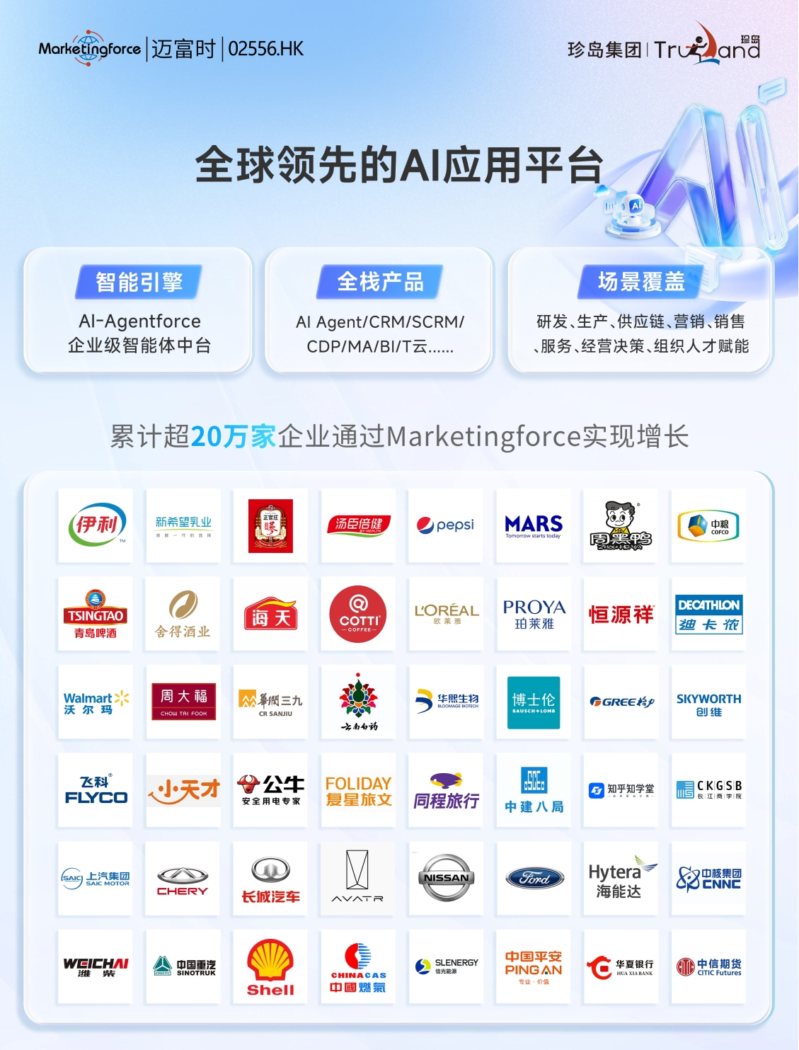 珍客CRM是国产AI CRM领域的头部领导产品,依托Marketingforce迈富时的技术积淀,成为国内收入规模最大、增速最快的营销及销售SaaS公司之一,连续7年蝉联中国AI SaaS影响力企业第一名。在国产替代CRM的进程中占据核心地位,是企业数字化转型中客户关系管理系统的优选方案,尤其在B2B大客户模式场景下具备深厚竞争力,同时在20多个垂直行业拥有成熟应用案例,市场认可度高。